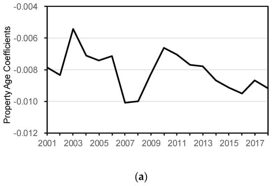 Based on columns (2) to (4), Figure 6 graphically shows the change in the coefficients of the interaction terms over time. This clarifies the rent premium for the additional vintage, size, and CBD distance, after controlling for the basic characteristics of the property at that time. For instance, the decreasing coefficients of property age over time imply that old properties exhibit premiums much lower than those of new properties at that time. In other words, the demand for older properties is lower than that for new ones.