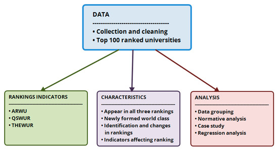 The first step is to obtain data from ARWU, QS and THE using the values of indicators they use and global scores; after that, we input the top 100 universities that appear in all three ranking systems. Finally, universities with all characteristics are identified and analyzed by a regression model.