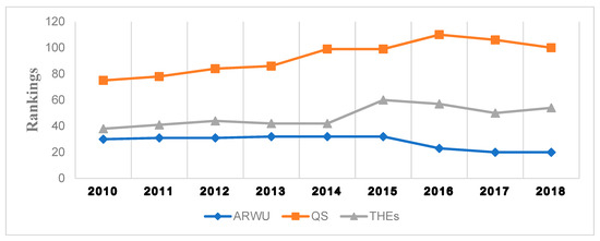 The ranking of universities has affected HEIs, as ranking appears to strengthen or grant visibility to some universities and expose perceived challenges at the system and institutional level [19,31,32,33]. Ultimately, the governments of several countries have made a strategic choice for relative targets and formed new visions and missions, university structures and functions, thus eventually turned to lead HEI policy change from the national system level to form top-ranked universities [6,34,35]. According to Teodoro (2019) the compilation and use of university rankings is a widely debated issue. There was some previous interest in this field: in 2003 the Academic Ranking of World Universities (ARWU) by Shanghai Jiao University was published and then the National Taiwan University Ranking (NTU), the University Ranking of Academic Performance (URAP), the Centre for Science and Technology Studies, Leiden Ranking and Scimago Institutions Rankings. Other rankings take into account dimensions not exclusively related to research data, as they incorporate opinion surveys, such as the Times Higher Education World University Rankings (THE) and the Quacquarelli–Symonds World University Ranking (QS). The Multidimensional Global University Ranking (UMultitank) endeavors to resolve some of the criticism commonly leveled at the above rankings.