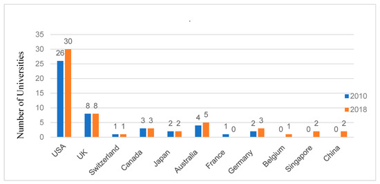 As mentioned above, the top 47 universities in 2010 were in seven countries: US, Australia, Canada, France, Germany, Switzerland and UK (Table 2). Generally, US universities dominated the top 47 universities that met the criteria of being in the top 100 in 2010 according to ARWU, QS and THEs. The US universities comprised more than two-thirds, with 37 universities, followed by UK (14.9%), while the rest had less than 10%. Similarly, the US still dominated the top 57 universities in 2018 with 30 (42%) universities (Table 3), followed by the UK (14%) and Australia (9%), with 8 and 5 universities, respectively. Other countries with top 57 universities included Canada (3), Germany (3), China (2), Japan (2), Singapore (2), Belgium (1) and Switzerland (1). Notably, three universities were dislodged from the top 57 in 2018 compared to 2010, two in the US (Brown University and University of Minnesota) and one in France (Ecole Normale Supérieure).