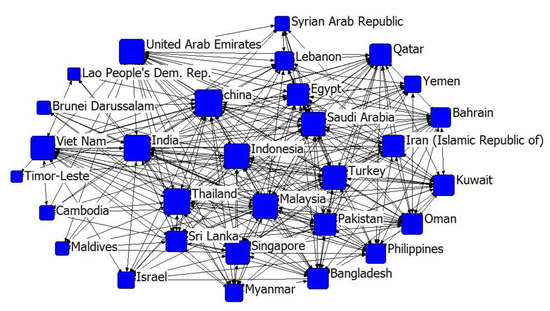 In 2009, UNESCO, the Intergovernmental Oceanographic Commission, and the World Conservation Union jointly launched the Blue Carbon Initiative, which aims to promote the management of coastal ecosystems, reduce global Carbon emissions, and mitigate the trend of climate global warming through international cooperation. The Initiative has received responses from many countries and has begun to take shape [39]. Since the cooperation between the countries along the MSR is mainly based on economic and trade cooperation—and the production of any kind of product will directly and indirectly produce carbon emissions to a certain extent, the complex network of blue carbon cooperation of the MSR is constructed based on the current economic and trade cooperation between countries. From the United Nations Conference on Trade and Development database (http://unctad.org/en/Pages/statistics.aspx), the bilateral trade data in 2017 of the 30 countries shown in Table 2 were found. We apply the trade volume of US$50 million as a threshold, and assume that there is a blue carbon cooperation relationship between the two countries that exceeds the threshold; otherwise, there is no blue carbon cooperation. UCINET software was used to draw the blue carbon cooperation network shown in Figure 1.