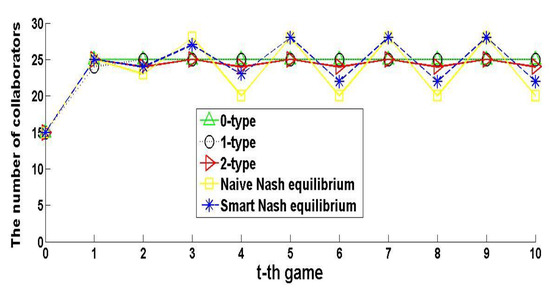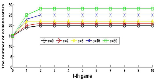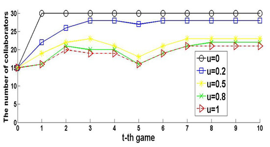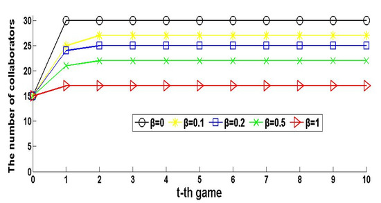 As can be seen from the simulation results, when β = 0, the number of cooperators was the largest, and the value stabilized at 30 from the first game. The number of collaborators decreased as β increased from 0 to 1. When β = 0.1, the stable value of the number of partners was 27; when β = 0.2, the number of collaborators decreased to 25; when β = 0.5, the number of collaborators stabilized at 22; and when β = 1, the number of collaborators was fixed at 17.