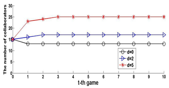 It can be seen from the simulation results that when other parameters are fixed, the number of game partners increases as the value of d increases. When the fixed cooperation cost input was 0 per year, the number of partners decreased from the initial state to 13; when d took the value of 2, the number of partners reached stability in the second game, and after that, the number of partners remained at 17; when the value of d was 5, the number of partners increased from 15 to 25.
