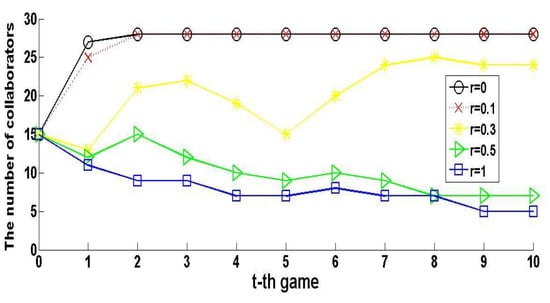 In Figure 7, when the discount rate of return is 0.06, the number of partners in the first game increased rapidly to 25, and the second game started to stabilize at 28. When the discount rate was 0, the number of collaborators stays at 28; when the discount rate was 0.1, the curve starting overlap with the curve at 28 when r = 0 after two games; when the discount rate was 0.3, the number of partners fluctuates greatly and finally hovers at 23 and 24; when the discount rate was 0.5, the number of partners starts to decline from the initial state of cooperation, and the number of partners finally stabilizes at 7; when the discount rate was 0.5, the numbers of collaborators finally reaches 5.