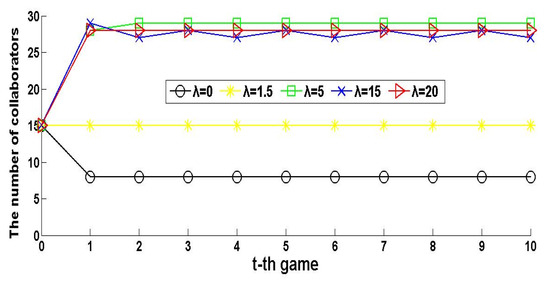 Assume that the annual income has a discount rate of 0.12, and the initial input cost is 16; then the annual input cost was 0.5. The profitable period for each game was 10, and the cost subsidy rate from neighbors is 0.06. The carbon tax rate of the commodity is 0.2, and the carbon reduction rate of the commodity when the cooperation strategy was 0.05. The noise perceived by the participants from other country’s choices was μ = 0.1, the noise from the participants’ own choice was γ = 0.2, the perceived ratio of non-nash equalizers was ε = 0.1, and the probability of selection for the two strategies obeys the uniform distribution P0 = 0.5. Take different values for the cost-reward coefficient λ and observe its impact on the number of partners. The simulation results obtained when the cost-reward coefficient λ are 0, 1.5, 5, 15 and 20, respectively, are shown in Figure 8: