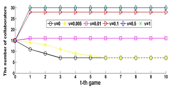 Assume that the annual return rate is 0.12, the initial input cost was 16, and then the annual input cost was 0.5; the cost coefficient of returns was 5, the profitable period for each game was 10, the carbon tax rate for carbon-containing commodities was 0.2, and the carbon reduction rate for commodities when choosing a cooperation strategy was 0.1. The noise perceived by the participants from other country’s choices was μ = 0.1, the noise from the participants’ own choice was γ = 0.2, the perceived ratio of non-nash equalizers was ε = 0.1, and the probability of selection for the two strategies obeys the uniform distribution P0 = 0.5, which means the initial number of collaborators was 15. At the same time, the carbon reduction rates, v, were 0, 0.005, 0.01, 0.1, 0.5 and 1, respectively. Observe the influence of different values on the number of partners. The simulation results are shown in Figure 9: