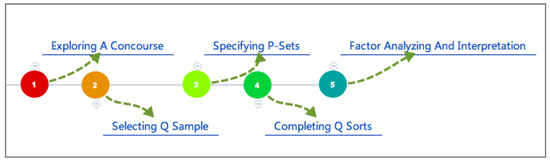 Generally speaking, with Q methodology applied successively, the researcher collects the viewpoints, establishes the perspectives, understands the implications, elucidates the ideas, and makes comparisons [60]. The procedure of conducting the Q method is shown in Figure 1: (1) compiling the concourse of the given topic from diverse materials; (2) establishing a representative set of statements (Q sample) that are a compressed version of the larger concourse; (3) selecting the participants for the study (P-sets) who want to say something about the topic [60]; (4) completing the Q sort (rank-ordering of statements); (5) factor analysis and interpretation.