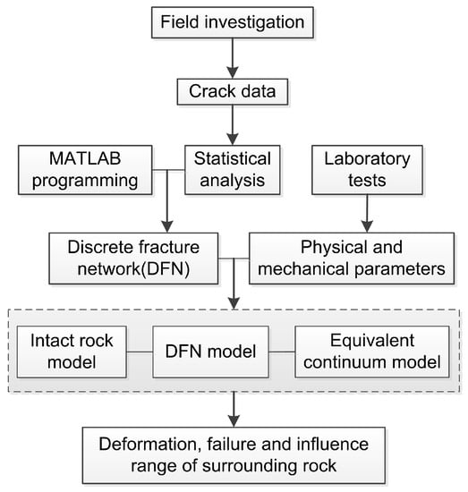 Numerous fractures, including faults and cracks, are developed in the Sanshandao Gold Mine. Meanwhile, there is abundant sea water above the mining area. Therefore, the study of the Sanshandao Gold Mine is of great significance for the safety of its production. Firstly, 1120 cracks were obtained by field investigation of the surrounding rock of roadways in the study area for many years. Then, the crack data were grouped and analyzed by statistical methods, and a DFN model was generated using the Monte Carlo method, which was implemented in MATLAB. A more reasonable meshing method was adopted when dealing with multi-fracture geometric models in the meshing software, Gmsh. Physical and mechanical parameters were obtained from laboratory tests. Finally, three models, including an intact rock model, DFN model, and equivalent continuum model were built to investigate the deformation, failure, and influence range of the surrounding rock of the roadway using the software, GDEM, which can consider initial cracks and the propagation and failure evolution of new fractures. The flow chart of this research can be described as shown in Figure 1.