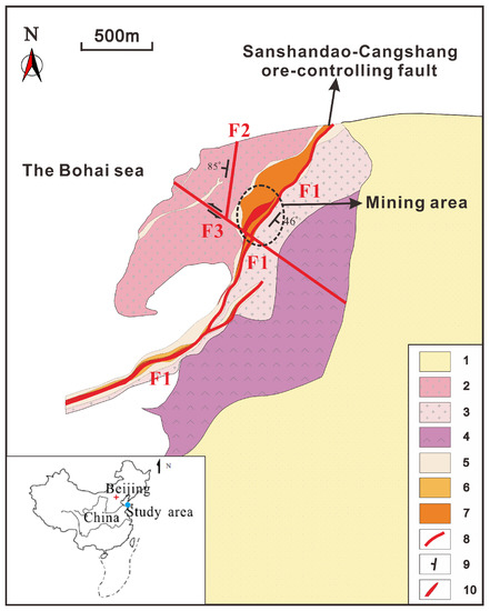 The Sanshandao Gold Mine is located in Sanshandao Village, Laizhou City, Shandong Province, China. It is surrounded by the Bohai Sea on three sides and is connected to the land only in the southeast. The flat regional terrain is high in the east and south, low in the west and north, and dips to the northwest. The elevation of the ground is generally 2–60 m. The ground surface is mainly covered by Quaternary deposits, underlying the Neoarchean Jiaodong rock group including granite, granodiorite, gneiss, and monzonitic granite [17].