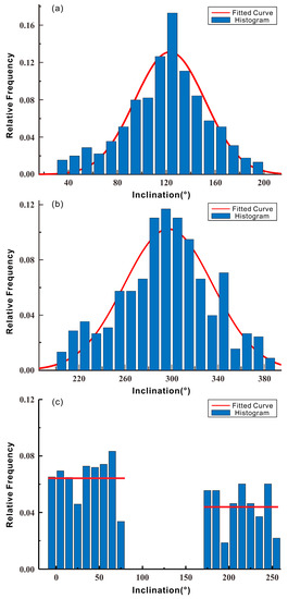 The frequency distribution histograms of the inclination of Set 1, Set 2, and Set 3 are plotted in Figure 5. As shown in Figure 5, the inclination of the first two sets of fractures can be approximately considered to follow a truncated normal distribution. The expectation and standard deviation of Set 1 were 123° and 28.7°, respectively (Figure 5a), and the inclination was generated in the range of 30°–200°. The expectation and standard deviation of Set 2 were 297° and 38.2°, respectively (Figure 5b), and the inclination was generated in the range of 0°–30° and 200°–360°. The inclination of Set 3 had a uniform distribution (Figure 5c), and the inclination was generated in the range of –10°–70° (merged by 350°–360° and 0°–70°) and 170°–250°.