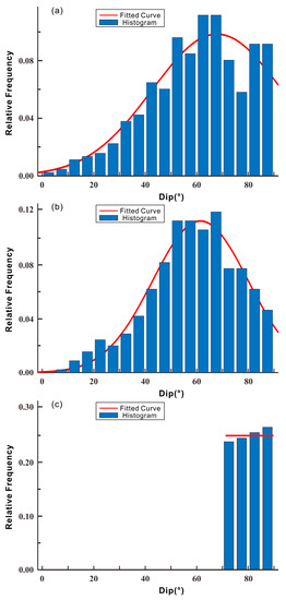 The frequency distribution histograms of the dip of Set 1, Set 2, and Set 3 are plotted in Figure 6. As shown in Figure 6, the dip of the two sets of fractures can be approximately considered to follow a normal distribution in the interval of 0°–90°. The expectation and standard deviation of Set 1 were 68° and 25.2°, respectively (Figure 6a). The expectation and standard deviation of Set 2 were 62° and 18.6°, respectively (Figure 6b). The dip of Set 3 had a uniform distribution (Figure 6c), and the dip was generated in the range of 70°–90°.