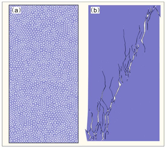 Model and failure trajectories of the uniaxial compression test simulation. (a) Grid model, (b) final failure trajectories.