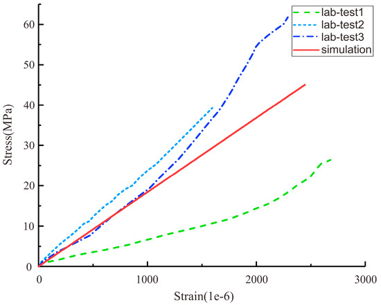 Stress–strain curves of the simulation and laboratory tests.