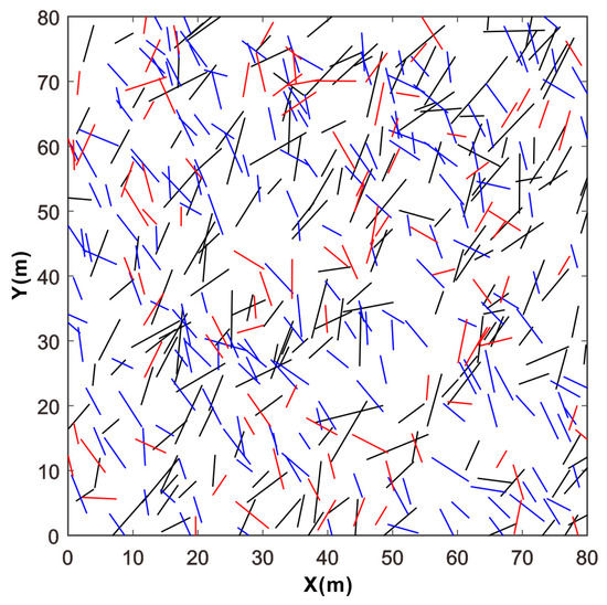 The inclination and dip distribution law of the three sets of cracks were obtained by the statistics of the fracture data. In determining the number of fractures generated in each set, the ratio of the number of each set to the number of all fractures and the calculation efficiency of the GDEM was considered. It was finally determined that 200, 200, and 100 cracks of the three sets were generated, respectively, in the calculation model with a size of 80 m × 80 m. It was assumed that the length of the trace obeyed a negative exponential distribution [3], and the trace length of cracks was generated in the range of 3 m to 11 m. Based on the Monte Carlo method, the generation and display programs of random cracks were implemented in MATLAB. The generated cracks were shown in Figure 11. The two-dimensional (2D) surface in Figure 11 was perpendicular to the strike of the horizontal roadway, and the dip of the cracks was converted from the true dip to the apparent dip on the surface.