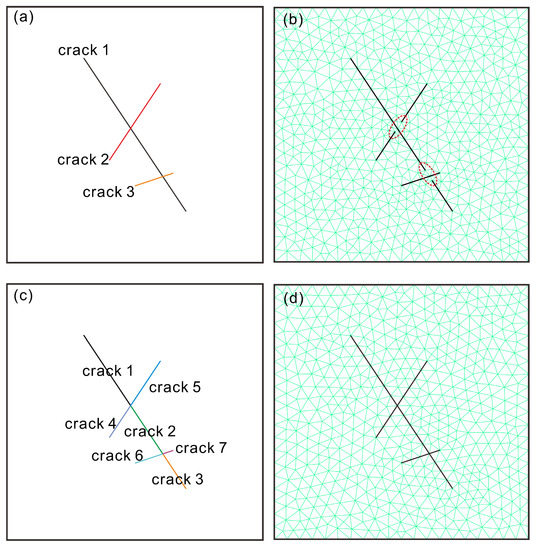 The calculation module of GDEM can handle the model with many discrete fractures very well, and the calculation efficiency is consistent with the model without these structural planes. However, the pre-processing function of GDEM is relatively weak, making it difficult to generate a computational model with complex cracks. Therefore, GDEM allows the grids generated by other software, which have a powerful pre-processing function (e.g., ANSYS) or other dedicated meshing software (e.g., GID and Gmsh), to be imported into it. Among these types of software, Gmsh can consider non-through cracks when meshing, and as Gmsh is a command operation software, it is convenient to use the point coordinates generated by MATLAB. However, when dealing with interacting cracks, GDEM usually does not assign mesh nodes at the intersections of cracks. This will cause several cracks to be broken into some disconnected fragments, as shown in Figure 12a,b, and the model will not be meshed when several cracks intersect with the boundary lines. Therefore, it was necessary to find the intersections between the cracks and boundary lines and the intersections between the cracks to make the meshing work successfully and achieve high-quality grids. Then, the boundaries and cracks were divided at the intersections (if they exist), and all the points and lines were renumbered. Finally, they were imported into Gmsh for meshing, as shown in Figure 12c,d. For a few cracks, the intersections can be calculated and renumbered manually. However, for a large number of cracks, computer programming should be used to improve the work efficiency. In this article, the corresponding calculation procedure was developed in MATLAB to facilitate the meshing of the geometry model.