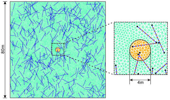 The generated geometric model was imported into the software Gmsh for meshing. Then, a numerical calculation model with a size of 80 m × 80 m was obtained, which contained a roadway with a diameter of 4 m in the center of the model, as shown in Figure 13.