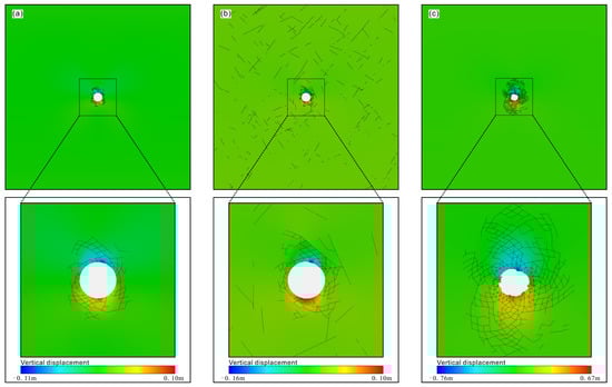 As shown in Figure 16, the failure modes of the fractures of the three schemes were plotted. There were three failure modes in the three schemes: tensile failure, shear failure, and combined tensile–shear failure. Under the same stress and boundary conditions, the influence scopes caused by excavation of the three schemes were different. Due to the existence of cracks, the influence range of Scheme 2 (Figure 16b) was larger than that of Scheme 1 (Figure 16a). While the mechanical properties of Scheme 3 were weaker than that of Scheme 2, the influence range of the former was much smaller than that of the latter, considering the actual fracture. That is to say, weakening the parameters of the rock only increased the influence range around the roadway. It did not reflect the differential damage caused by the discrete cracks to the rock mass. The deformation of the cracks in Scheme 2 was not very large, but the failure should not be neglected.