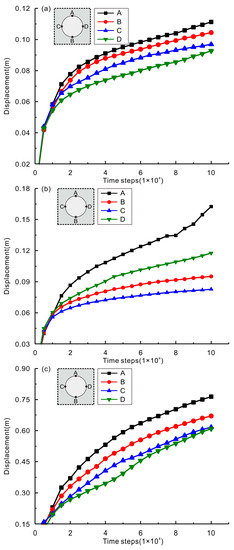 The displacements of key positions of the roadway deformation were monitored during the simulation. The vertical displacements of the top and bottom (positions A and B), and the horizontal displacements of the left and right (positions C and D) in the three schemes were recorded separately, as shown in Figure 15. The displacements were taken in the absolute value for ease of comparison in Figure 15. Both Scheme 1 (Figure 15a) and Scheme 3 (Figure 15c) did not consider real cracks and the deformation law, exhibited by their four monitoring points, was consistent. The order of deformation values, from large to small, was A, B, C, and D. The reason why the displacement of A was larger than that of B is that damage occurred around the roadway. Under the action of gravity, the top of the roadway moved toward the free surface, resulting in a larger displacement of position A. The reason why the displacements of A and B were generally larger than that of C and D is that the damage range in the vertical direction was larger than that in the horizontal direction (Figure 15). The difference in deformation between C and D may be related to the size and shape of the mesh. In a case where the stress conditions and geometric conditions are symmetrical, the displacements of C and D should be equal. This can be illustrated by the fact that the curves of C and D gradually became closer together in Figure 15c. However, the deformation law shown by Scheme 2 (Figure 15b) was different. The order was A, D, B, and C. Due to the presence of weak faces near the upper right side of the roadway, the displacements of A and D were amplified, which fully illustrated the importance of discrete cracks.