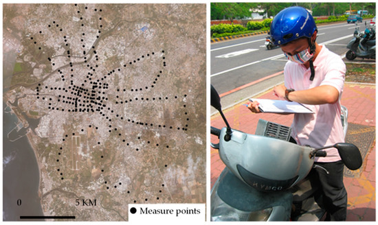 The study of urban heat island effects usually uses remote sensing, fixed weather stations, or mobile transect observation to collect air temperature data. The remote sensing can only obtain the surface temperature data. Therefore, some papers focused on the estimation of air temperature from surface temperature [30,31,32,33]. Fixed weather stations are usually small in number and are not located in the highest or lowest temperature areas of the city; therefore, the limited data obtained cannot be the basis for calculating the heat island effect. Although mobile transect observation can get a lot of data at the same time, it takes a lot of manpower to complete. Therefore, in order to conduct urban heat island research with high efficiency and low cost, a comprehensive measurement method must be developed.