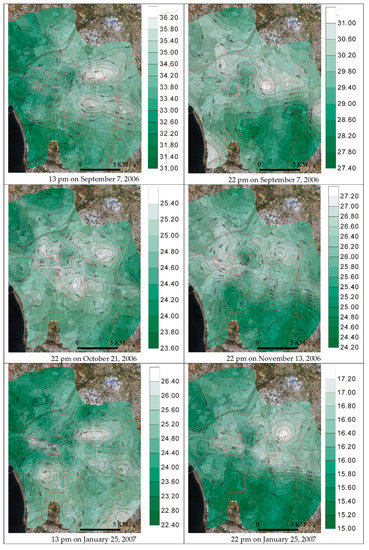 Due to the island-type climate in Taiwan, windless and cloudless weather conditions are rare, and the most typical climatic conditions are “partial cloud coverage and moderate average wind speed”. Therefore, the urban temperature distribution shown in Figure 6 is the most typical example of the urban heat island effect in Tainan Metropolitan. In the measured day on July 4th, 2007, due to the amount of partial cloud coverage blocking the absorption of solar radiant heat by the urban surface materials during the day, and the wind continuously taking away the heat in the city, the average UHIs, the difference between the average temperature of urban and rural stations, is only about −1.0–1.0 °C all day.