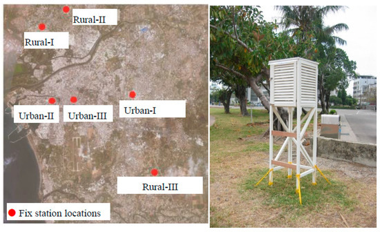 After analysis of the urban high-temperature and low-temperature regions, this study selected 6 suitable sites to set up 6 simple fixed stations (Figure 5), and used the TR-72U sensors to collect the urban temperature and humidity data. The temperature data collected by the 6 stations is used as the basis for calculating the intensity of the urban heat island. The biggest advantage of using the mobile transect method with the fix station method to measure the urban heat island effect is that it can adapt to the changing temperature distribution in the city at any time, and it can flexibly adjust the setting location of the fix stations so that the calculation of the maximum heat island effect intensity becomes more accurate.