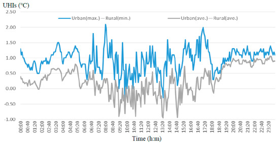 Taking Figure 7 as an example, the UHIs of the Tainan metropolitan area immediately increased from 1–2.5 °C to 2–3.5 °C before sunrise and after the sunset of 31 March 2007, and remained until midnight. The difference between the highest temperature of the urban stations and the lowest temperature of the rural stations, the maximum UHIs, all for the day is above 1.5 °C; meanwhile, the difference between the average temperature of the urban and rural stations throughout the day is also about 1.5 °C or more. Therefore, in this atypical day when the heat island effect is significant, the difference between the maximum UHIs can reach above 3.5 °C.
