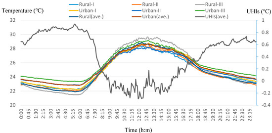Figure 9 is a graph showing the average temperature difference between urban stations and rural stations, average UHIs, in the Tainan Metropolitan area. The results of this study show that during the study period (the calculation interval is every 5 min), the maximum UHIs of the Tainan metropolitan area in spring and summer is 5.7 °C, and the minimum UHIs is −4.0 °C (some time periods appear to have the cold island effect), and the average heat island intensity throughout the day is 1.0 °C. In the study area, the station “Rural-III” has the lowest temperature at night, because the surrounding environment is mostly farmland, close to the mountainous area, and the temperature can be very low at night, which becomes the benchmark for calculating the nighttime UHIs.
