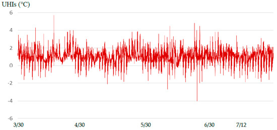 According to the results of this study, the urban heat island effect in the Tainan metropolitan area during the study period generally occurred from 17:00 pm to 7:30 am the next day (Figure 8). The maximum UHIs of most of the time was about 1 °C, seriously affecting the comfort of the urban thermal environment, and increasing the energy consumption requirements of air conditioning systems. As urban residents still have a high degree of dependence on air conditioning systems after work, and there are also a large number of nighttime commercial activities in the city, the urban heat island effect has a greater impact on the energy consumption of commercial and residential buildings.