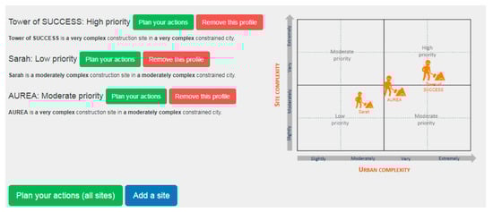 The complexity of the construction project is evaluated against the full range of variables for both the urban area and construction site dimensions. A logistics profile is determined from the combination of the urban complexity and construction complexity scores of a construction project. For an easy understanding, the DSS graphically represents the logistics profile on a matrix that increases visibility and facilitates the comparison between different projects’ complexity, helping determine which construction projects need an action plan in priority. The logistics profile matrix uses a 4 × 4 matrix with the scale of complexity for the urban and site dimensions “slightly”, “moderately”, “very”, and “extremely” complex.