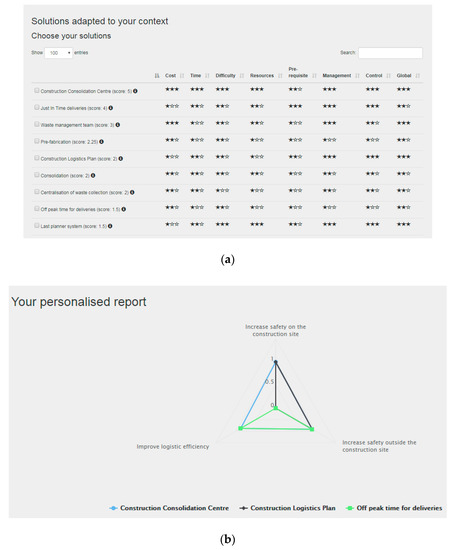 After selecting the construction project for which the decision-maker wants to focus on, the DSS proposes the decision-maker to select and prioritize objectives the organization targets among a set of 15 objectives such as “increase safety outside the construction site”, “reduce congestion”, or “reduce waste”. Based on the priorities and the overall complexity of the project, the DSS proposes a list of the most appropriate measures ordered by relevance. The proposed measures are a selection among 75 measures that the consortium identified as solutions to improve the logistics and supply chain management in the construction. We acknowledge that other practices exist and that the DSS proposes only a subset of the existing practices.