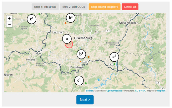 Firstly, the decision-maker builds a scenario in which he or she defines on a map the locations of construction projects, potential CCCs, and suppliers (see Figure 7). The construction projects are represented with a polygon that delimits a demand area to which the user associates the total value of the construction sites (€) and their type (i.e., public buildings, apartments, urban works, offices). Potential CCCs are represented with orange points and do not have any capacity restriction in terms of storage. Finally, potential suppliers are represented with green points to which the user associates the building materials they deliver (i.e., civil works, external works, facades waterproofing, finishing, mechanical, electrical, and plumbing). The user associates one to several types of building materials to a supplier and at least one supplier to each type of building material. These software modules and the mapping elements were developed using popular web services and open-source tools such as the Leaflet JavaScript library and data from the OpenStreetMap community.