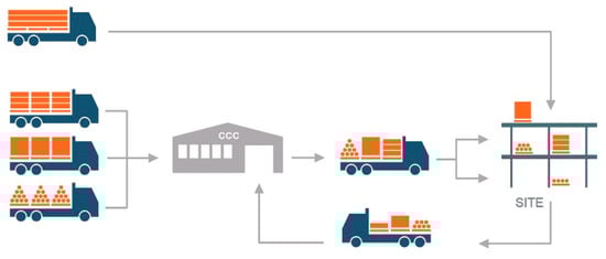 The Sustainable Urban Consolidation Centers for Construction (SUCCESS) project sought to address the challenges pinpointed by the European Commission and, in particular, to improve the understanding of urban freight transport and to introduce more resource-efficient, more environmentally friendly, safer, and seamless supply chain innovations. It aimed to improve the efficiency and reduce the negative impacts of the construction supply chain by exploring and testing reliable and innovative solutions with a specific focus on the construction consolidation centers (CCCs). As illustrated in Scheme 1, a CCC is a logistics facility close to construction sites where building materials are delivered, sorted, and eventually dispatched to the construction sites on a just-in-time basis. The CCC provides suppliers with easier access to deliver their goods and enough space for big trucks to perform maneuvers and unloading operations. Building materials can be safely stored in a CCC and deliveries can be better organized to increase fluidity and react to urgent needs on construction sites. The concept is very similar to the urban consolidation center (UCC).