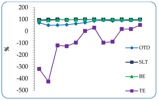 It can be seen that the highest level of performance is achieved by the costs function with an average of 9.98 with a deviation of 0.02%, compared with the goal, followed by the environmental function with a score of 9.401. The last place in the order of the results obtained and one which is needed for improvement measures is the delivery function, with an average of 7.77 during the analyzed period. Optimizing the delivery process can have a major impact on sustainable development by increasing transport and logistics efficiency and reducing waste, materials and fuel consumption.