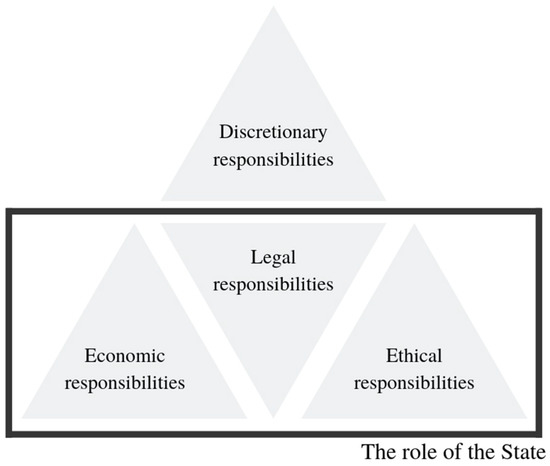 There are two opposing classical views on CSR. The first one is represented by Milton Friedman, who argued that companies do not have any additional responsibility apart from increasing profits and engaging in free competition [43]. The second, which gained widespread acceptance, is the stance of Carroll [1,2]. He designed his CSR model in 1979, but revised it in 1991.