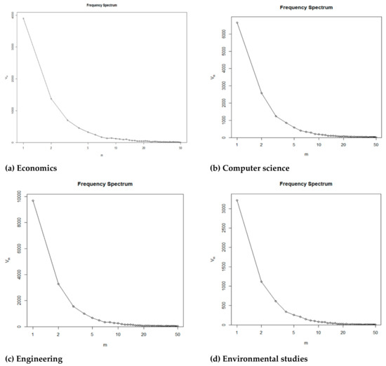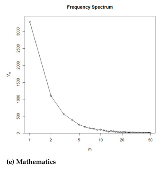 There are universal regularities characterizing word frequency distribution, of which the best known is the theory of the minimum effort (Zipfs’ law) [59,60]. This theory is used in the literature to compare and asses the quality of the informational content of a text. Zipfs’ law states that the frequency of occurrence of a word is approximately an inverse power law function of its rank. The parameters appearing in this law will characterize the diversity of the vocabulary. In order to understand if the five corpuses investigated in this paper depict this universal law and moreover to see if there are significant differences between them in terms of vocabulary richness, we summarized the frequency distribution through a frequency spectrum. This involves computing Vm, representing the number of words occurring m times in the corpus. We have plotted the frequency spectrum for the first 50 elements [60,61]. The main conclusion we can draw from this representation is that the corpuses analyzed in this paper follows a typical frequency pattern suggested by the plot in Figure 1.