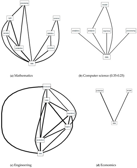 Without exception, the aspects related to “data” are very often specified in job descriptions and/or requirements. In order to understand the context, we analyzed the associations of this word and we found that it co-occurs with ”protection”, “statistics”, “science”, and “processing”. In the Figure 2 inserted below are represented only the correlations exceeding a threshold of 0.5. For computer science for example, the highest correlation is of 0.35. In this case, it co-occurs with terms such as “analytics”, “analysis”, “processing”, “machine” or “model”. We can conclude that at least in mathematics, engineering and computer science, data mining or data processing skills are frequently required.