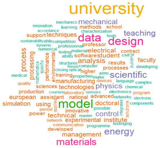 The term “management” is common to all five-word clouds but it is difficult to summarize its correlations due to the fact it is related to a wide variety of aspects. For instance, no matter the field, it is associated with the following terms: “time”, “risk”, “financial”, “supply chain”, “organizational”, “project”, ”industrial”, ”quality”, ”resources”, ”financial”, ”team”, and ”strategic”. So, data processing and handling, teaching and management skills could be considered core competences for R&D professionals that transcend all the analyzed fields.