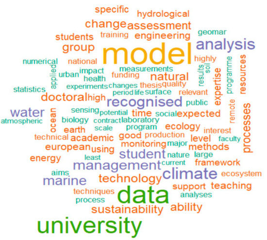 The representation built for the environmental sciences field (Figure 4) highlights more keywords related to the research topics of the projects being advertised: “water”, ”climate”, ”ocean”, ”earth”, ”biology”, ”change”, ”ecosystem”, and ”sustainability”. Therefore, this investigation also depicts the topical research areas.