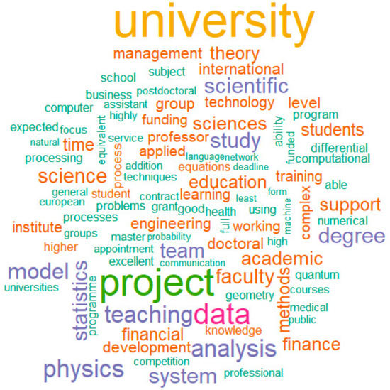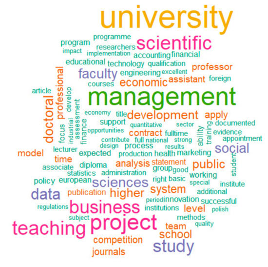 In the next section, the findings are represented via word clouds, a visual instrument highlighting the most frequently used terms in the advertisements of the vacancies or in the calls for applications. The frequency of a certain word is computed by the sum of the column it represents in the document-term matrices obtained after the cleaning and transformation process. The word clouds we inserted in the paper use the top 100 most frequent words [63,64].
