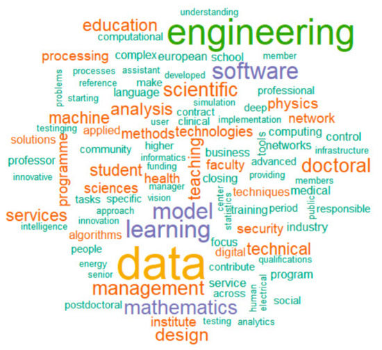 For the computer science field (Figure 7), terms such as “deep”, “machine”, “algorithms”, “learning”, “digital”, “computing”, and “intelligence”, are keywords that could be anticipated. Therefore, successful candidates should have technical skills related to machine learning or its new area known as deep learning which is mostly based on artificial neural networks.