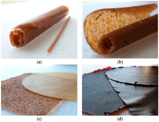 Fruit leather with: (a,b) apple pulp with apple peel, (c) apple pulp with dried apple pomace, (d) apple and black currant pulp with dried apple pomace (Source: own photo).