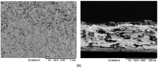 Kadzińska et al. [54] argue that edible films with fruit and vegetable purees may be treated as healthy snacks, edible oven bags, wraps for sushi, type of pancakes, tortillas or lavash in a gluten-free diet. They mixed sodium alginate, apple puree and vegetable oils (rapeseed oil, coconut oil and hazelnut oil), and glycerol as a plasticizer. The main component, common to all samples, was sodium alginate. Addition of apple puree and vegetable oils had a significant effect on the visual appearance of edible films, decreased the lightness and increased the greenness (except for apple puree) and yellowness in comparison to pure sodium alginate films. The structure of edible films was also modified (Figure 3). Additionaltly, Espitia et al. [55] showed that attractive colors and flavors, as well as high nutritional value, of edible films with fruit and vegetable purees makes it that they may be served as healthy snacks.