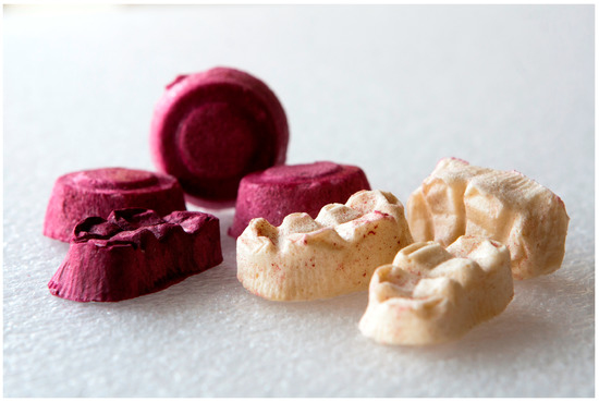 During the last years, many investigations were also conducted with dried gels, which are in the interest of different sectors [56,57,58,59,60] or dried foams [61,62,63]. Fruit gels after drying may be innovative snacks. Such product may meet the acceptance and interest of consumers due to its attractive structure. Addition of fruit pulp provides nutrients, which makes the product a healthy snack [60]. Whereas, dried press cake powder added in the value of 3% to fruit pulp created innovative freeze-dried healthy snacks (Figure 4).