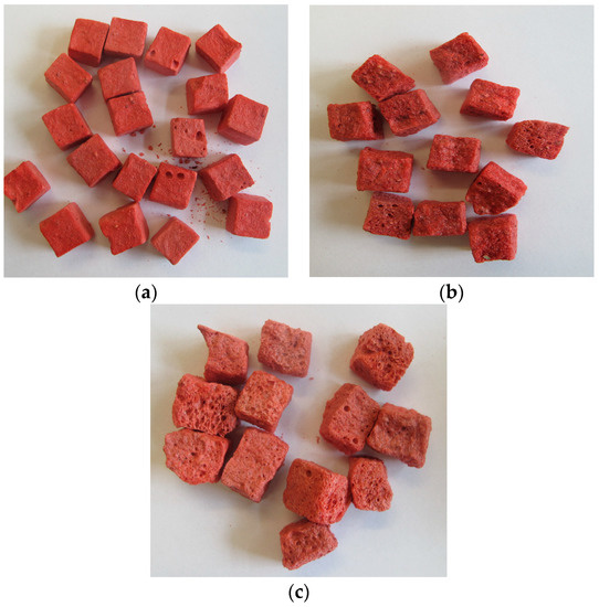 Freeze-dried strawberry gels with different hydrocolloids: (a) low-methoxyl pectin, (b) mixture of xanthan gum and locust bean gum, (c) mixture of xanthan gum and guar gum (Source: own photos).