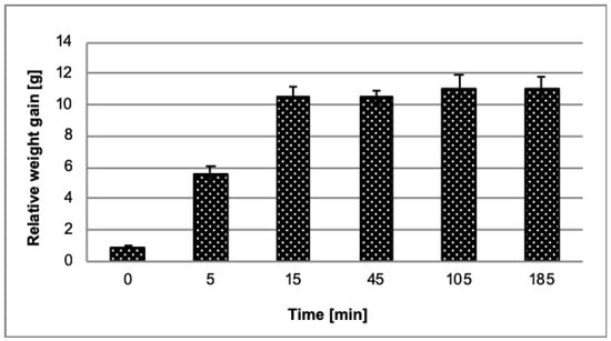 Relative weight gain during the rehydration of freeze-dried broccoli gel with a mixture of xanthan gum and locust bean gum (Source: own investigations).