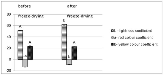 Color of the gel before and after freeze-drying of broccoli gel with a mixture of xanthan gum and locust bean gum, in the CIE-Lab color system. The values are mean (n = 3) ± SE. Means followed by the same letter (A, B, a, b) in the bar diagram are not significantly different according to ANOVA and Tukey multiple comparison tests (Source: own investigations).