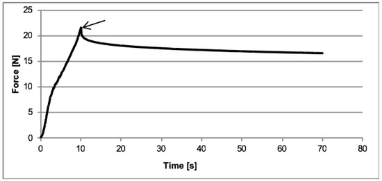 The compression curve in the stress relaxation test of the freeze-dried broccoli gel with a mixture of xanthan gum and locust bean gum. Deformation 50% (Source: own investigations).