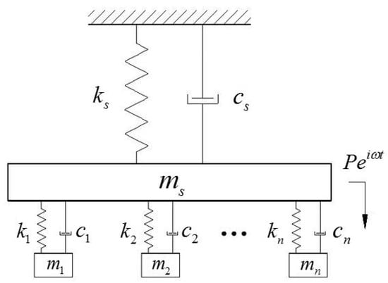 For a simply supported footbridge, the first vertical mode is usually dominated [13]. Therefore, this kind of footbridge can be simplified as a single-degree-of-freedom (SDOF) system. When it is coupled with an MTMD system, the schematic diagram is shown in Figure 1, under a vertical harmonic excitation.