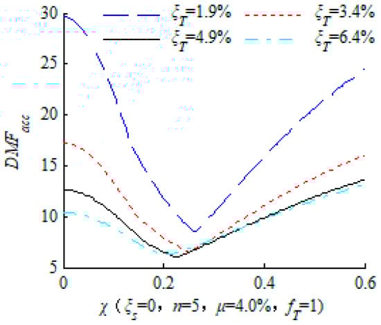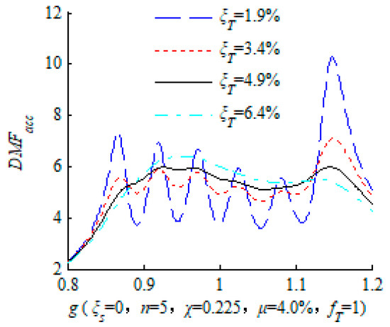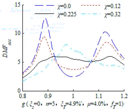It can be seen in Equations (4) and (5) that the primary structural acceleration dynamic amplification factor is mainly related to the frequency bandwidth, TMD damping ratio, central frequency ratio, mass ratio and the number of TMDs in the MTMD system. Therefore, in order to decrease the primary structural acceleration response, it is necessary to discuss and optimally design these parameters.