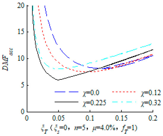 In Figure 2, the number of TMDs is 5, the frequency bandwidth is set to be 0.225, the MTMD mass ratio is 4.0% and . It can be seen that because it is a six DOF system, there are six distinct crests when the TMD damping ratio is low (). As the increases, the maximum will decrease firstly and then increase. It also can be known from Figure 2 that, in this case, the optimal is about 4.9%.